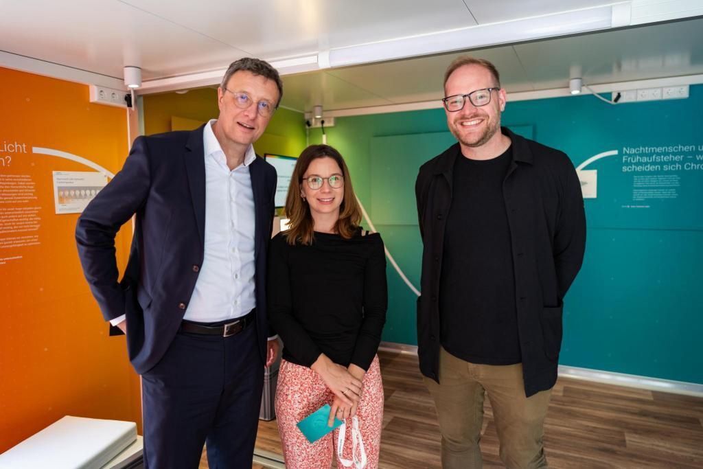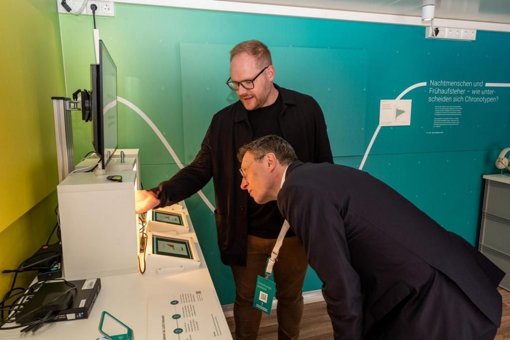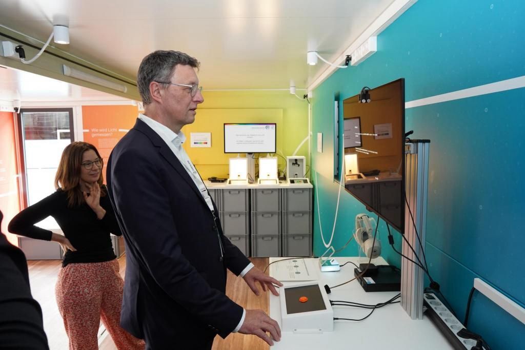 Die Roadshow unseres mobilen Forschungslabors hatte in München ganz besonderen Besuch: Patrick Cramer, Präsident der Max-Planck-Gesellschaft, ließ es sich nicht nehmen, persönlich vorbeizuschauen und nicht nur zuzusehen, sondern auch selbst an unseren Experimenten teilzunehmen. Als vielreisender Wissenschaftler, der nach eigener Aussage oft mit Jetlag zu kämpfen hat, zeigte er sich besonders interessiert an unseren Untersuchungen zu Lichtempfindlichkeit und Chronobiologie. Mit sichtbarer Neugier verfolgte er die Messungen, ließ sich die Funktionsweise des Stop-Signal-Tests und der Pupillometrie in der Lichtkugel erklären und diskutierte lebhaft mit dem Team über die Bedeutung individueller Lichtreaktionen für den circadianen Rhythmus.